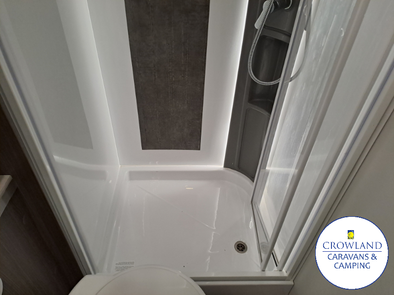 Rear washroom with a shower cubicle.
