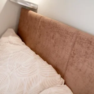 Inside, light wood tones and contemporary multi-colour cushions create a spacious and inviting atmosphere.